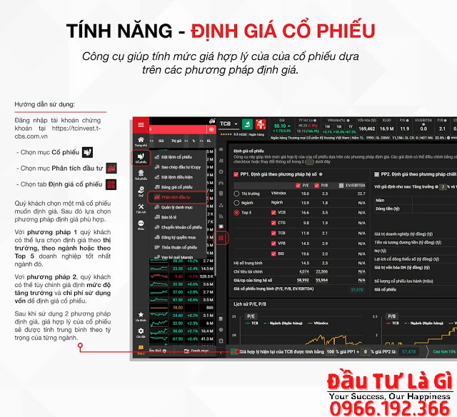 ĐỊNH GIÁ CỔ PHIẾU – tính năng mới duy nhất có tại TCBS sẽ giúp Quý khách tính toán mức giá hợp lý của cổ phiếu với vài thao tác đơn giản dựa trên 02 phương pháp: